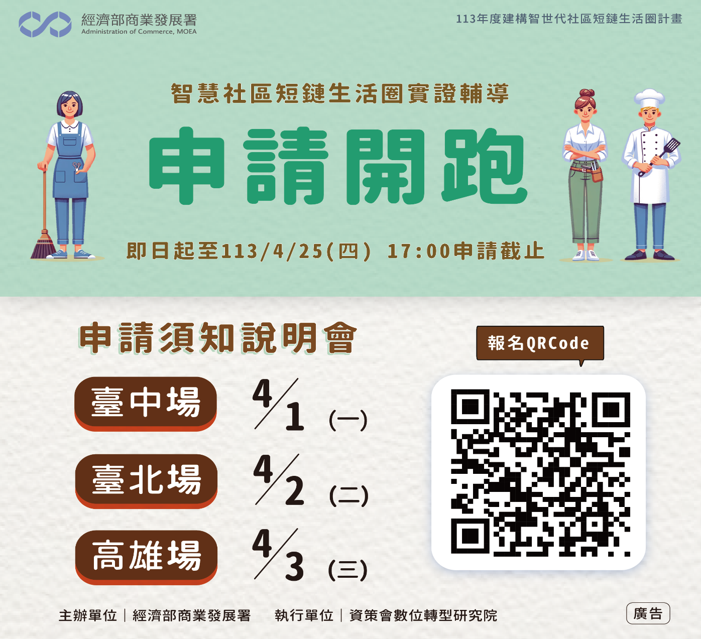 經濟部商業發展署辦理113年度「智慧社區短鏈生活圈實證輔導」,即日起受理提案申請,受理期間自即日起至113年4月25日(星期四) 下午5時止,歡迎有意發展智慧社區短鏈生活圈的業者提案申請!