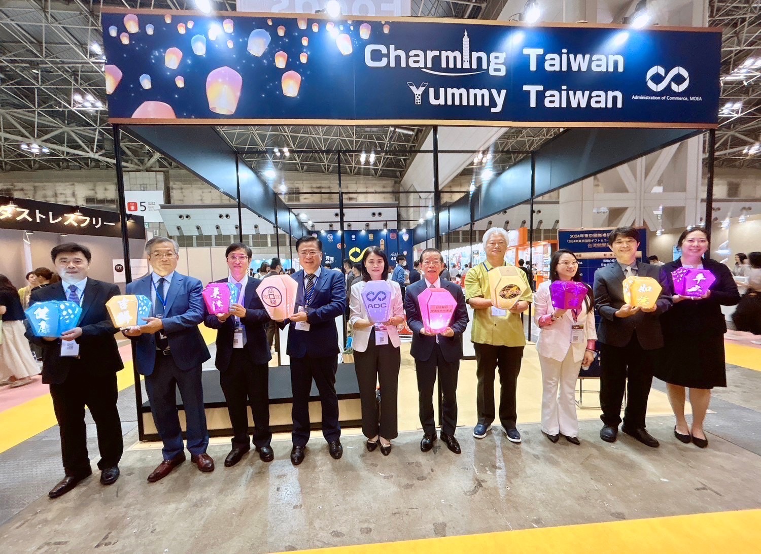 經濟部商業發展署蘇文玲署長率領15家臺灣老店及糕餅業者參與2024東京國際禮品暨家居品展,展中特別設置「Charming Taiwan Yummy Taiwan臺灣館」展出臺灣特色伴手禮。今(4)日下午由臺北駐日經濟文化代表處謝長廷大使、經濟部商業發展署蘇文玲署長、全國商業總會許舒博理事長以及日本台灣商會聯合總會東鄉清龍總會長於臺灣館中共同主持「讓天燈亮起來」點燈儀式,一起點亮臺日商機。